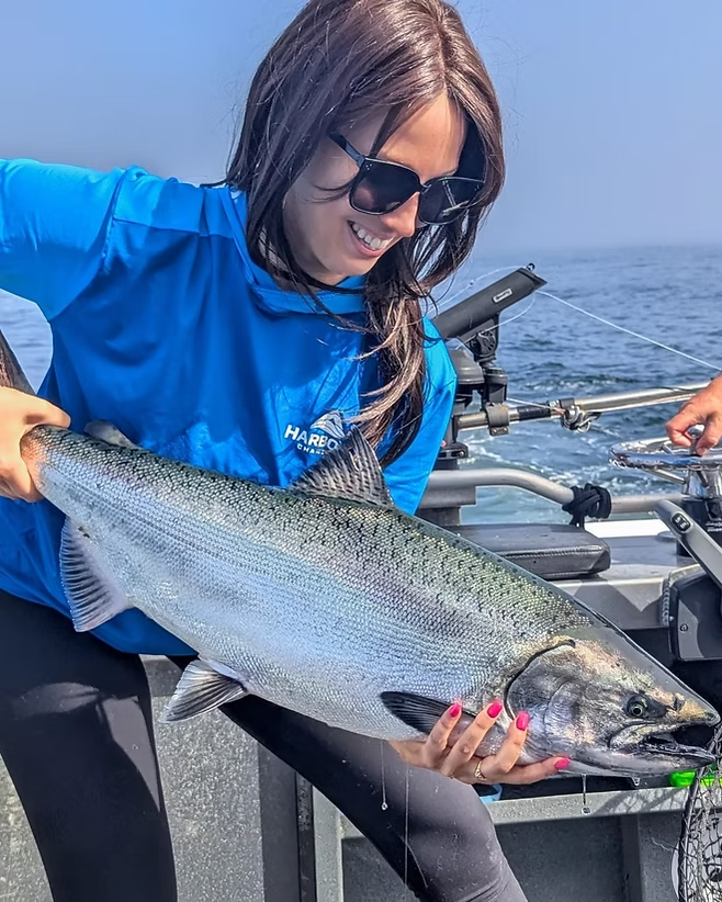 Coho salmon bring a completely different energy to winter fishing. These acrobatic fighters rarely disappoint, jumping clear of the water multiple times during a fight. Winter Cohos in Comox average 6 to 12 pounds but what they lack in size compared to Chinooks, they make up for in pure athleticism. They're often found shallower than Kings, sometimes just 40 to 60 feet down, and they'll hit lures with aggressive strikes that leave no doubt you're hooked up. Cohos school up during winter months, so when you find one, there's usually more around. They're particularly active during low-light periods – early morning and late afternoon – which fits perfectly with the charter's timing. Their bright silver sides and incredible jumps make them a world-class gamefish, and their firm, flavorful meat is outstanding on the table.